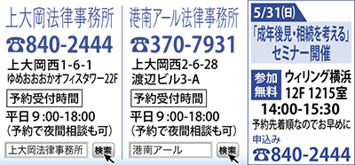 上大岡を中心に活動する弁護士の水口かれんさん(上大岡法律事務所)と高栁良作さん(港南アール法律事務所代表)が5月31日(日)、「成年後見・相続を考えるセミナー」を開催する。地元弁護士が分かりやすく解説してくれるので、自身や親の将来について考える機会にしてみては。