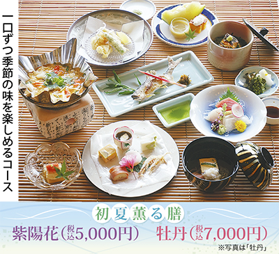 同コースは6月30日(火)までの期間限定。5000円の「紫陽花」と、7000円の「牡丹」の2種類がある(税込、昼夜とも同一料金)。四季の移ろいを楽しめる同店の中庭を眺めながら、家族や友人らと時にはゆったり懐石を味わっては。