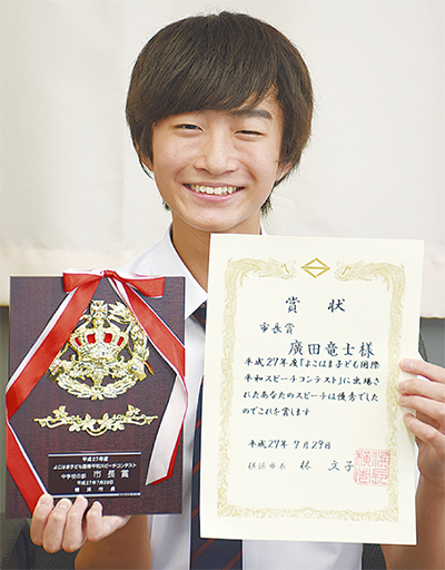 7月28日、29日に西公会堂で「よこはま子ども国際平和スピーチコンテスト」が開催され、上永谷中学校3年の廣田竜士(りゅうじ)君が最高賞となる市長賞を受賞した。11月上旬には「よこはま子どもピースメッセンジャー」としてニューヨークの国連本部を訪問する予定だ。