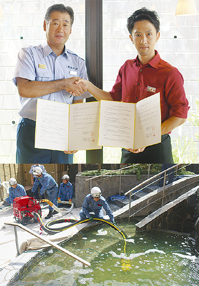 これは災害によって消火栓が使用できない場合に備えるもの。今回の覚書により港南署と港南消防団は、大規模地震等発生時に同施設の温泉水等153㎥や敷地を消火活動に使用できることになった。当日は締結式の他、実際に同施設の温泉水を使った給水・放水訓練も実施された。