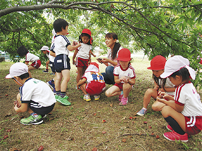 毎年たくさんの栗が収穫できる栗林は200坪ほどの広さ。30年近く園児による栗拾いを実施しており、収穫した栗は、各家庭に持ち帰ってもらうほか、園で栗ごはんにして食べている。