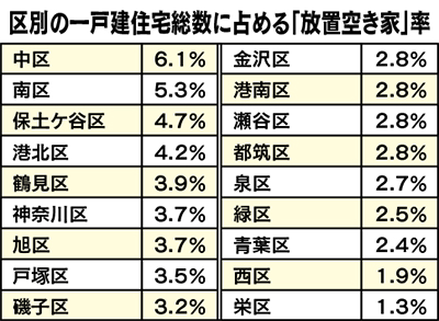 市内の空き家のうち、「放置空き家」(別荘や売却・賃貸用以外の長期に渡り人が住んでいない住宅)に分類されているのは2万760戸(3・4%)。前回統計調査から約1・3倍増加している。区別で比較すると「放置空き家」率が最も高いのは中区(6・1%)。南区(5・3%)、保土ケ谷区(4・7%)など古い住宅地の残る都心部で高い傾向だ。
