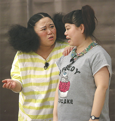 港南台バーズ1階のイベントスペース「ドゥファッションプラザ」で16日、人気お笑いコンビ「ニッチェ」がショートコントなどを披露した=写真。