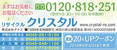 市内に4店舗を構えるリサイクルショップ「クリスタル」は、電話1本で女性スタッフが無料出張買取。20年の信頼と実績があり「安心で便利」との声も多い。