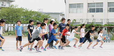 参加したのは区内7校の小学4年から6年までの児童約40人。横浜市陸上競技協会の高野彦一さんが指導役を務め、「スポーツをするためには心・技・体の充実が必要」と呼びかけた。子どもたちはステップハードルを使って上手な走り方の基本を学んだほか、走り幅跳びの基礎練習やジャベリックボールといわれるボールを使った投げ方の練習にも取り組んだ。