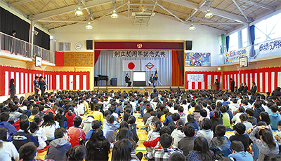 式典では記念品の贈呈があり、創立50周年事業実行委員の高森政雄委員長から児童に全クラス分の電波時計と図書を増やすための書架が贈られた。各学年がテーマを決めて50周年に思いを寄せたビデオも上映。児童の取組や地域の魅力を紹介したほか、卒業生が小学生の時の友達や仲間の大切さを伝えるメッセージを紹介した。