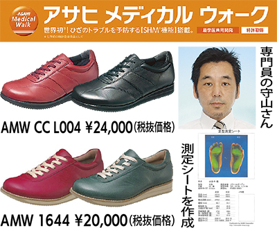 「相談会」では足の状態を無料計測。守山さんも来店し足の悩み解消に導く。希望者は、直接現地へ。アサヒシューズの直営店の同店は、テレビなどでも取り上げられた本気で足と膝を考えたシューズ「アサヒメディカルウォーク」も販売。県下No.1の品揃えで、足に合った靴を提案してくれる。また、この時期に最適な「濡れない」「ムレにくい」「滑りにくい」靴、トップドライも販売するので見逃せない。