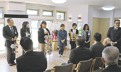 式典には約40人が参加。同社の河野社長があいさつに立ち、職員や施設で働くスタッフらを紹介。関係者が祝辞を述べた。日本舞踊のお披露目もあり、和やかな雰囲気の中、新たな施設の幕開けを祝った。
