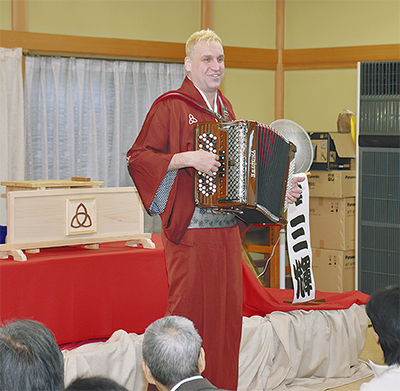 三輝さんは上方落語協会会員で、1999年に来日。8年間、横浜市内に在住していたこともあるという。2008年に桂三枝さん(現・六代桂文枝さん)に弟子入りした。現在はロンドンに在住し、世界へ日本文化を広める活動にも力を入れている。この日、三輝さんはアコーディオンを演奏しながら登場。自己紹介から始まり「上大岡での公演は初めてなので、デビューになる」と笑顔を見せた。その後はアコーディオン漫談を披露し=写真=、前座噺の「寿限無」を反対から早口で読み上げたほか、英語やフランス語などでも披露し、会場の笑いを誘った。