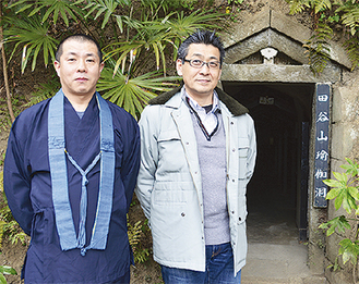 保存活動は栄区飯島町出身の田村裕彦さんと、同寺の渡辺隆人副住職が協力して企画。建築設計事務所の代表を務める田村さんが2年前にこの洞窟の補修工事に携わった際に、同寺の総代から相談を受けたことをきっかけに始まった。