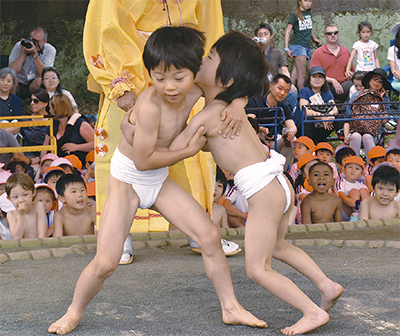 学校法人信栄学園(石塚薫子園長)が運営する野庭聖佳幼稚園(港南区野庭町)・聖佳幼稚園(横須賀市)の園児と、大相撲宮城野部屋の若手力士が交流を行う恒例行事「大相撲聖佳場所」が6月3日、横須賀市の桜小学校にある土俵を使って行われた。まわしを身に付け、ちびっこ力士となった両園の園児250人が力強い取組みを見せた。
