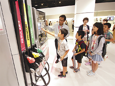 ガソリンスタンドなどで使われているガソリン計量器のメーカーとして国内トップシェアを誇る同社。今回は同社製品が並ぶ工場内のショールームで、参加者はガソリンの代わりに水を使った「給油」の模擬体験などに挑戦した。また今回のテーマ「エネルギー」にちなみ、石油燃料のほか水素エネルギーなどについても同社担当者から説明を受け、熱心に耳を傾けていた。