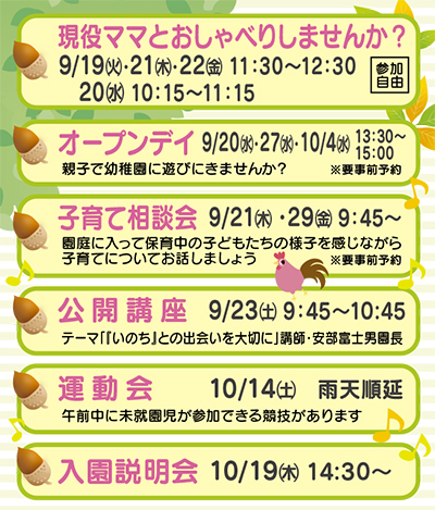 有本「安部幼稚園はママたちの活動も盛んだと聞き、入園前は子育てが精一杯だったので正直心配でした。けれど通園で毎日多くのママたちと顔を合わせる日々は、なんだか学生時代に戻ったような楽しさがありました。また下の子を連れていると気にかけてくれる人が多く、それまで育児で人の手を借りることに慣れていなかった私も少しずつ頼れるようになりました」