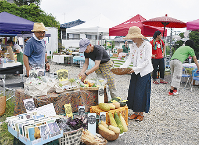 港南区野庭町の洋菓子店「ストラスブールノバ店」(寺田司代表)の駐車場で8月26日、初めてのマルシェ「Yokohama Noba de marche」が開催され、野菜や雑貨、キッチンカーなど8店が並び、地域住民が買い物を楽しんだ。