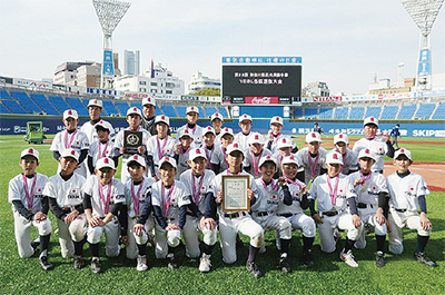 少年野球の県民共済旗争奪横浜市各区選抜大会の決勝戦が3日、横浜スタジアムで行われた。港南区の選抜チームが初めて同大会の決勝に進出した。試合は鶴見区選抜に逆転を許して惜敗したものの、準優勝に輝いた。