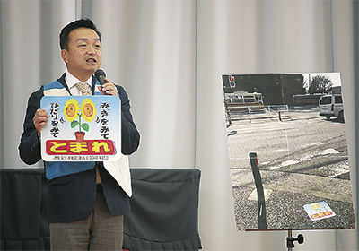 ステッカーは路面に貼るタイプのもので、学校ごとに危険な箇所を検討してもらった上でそれぞれ4カ所ずつに設置。貼り付け作業は同会会員の手で行われたという。贈呈式で児童の前に立った江塚会長は、危険箇所にステッカーを貼ったことを報告しつつ、「ステッカーのないところでも危ない場所はある。信号が青でも十分に注意して横断しましょう」と呼びかけた。