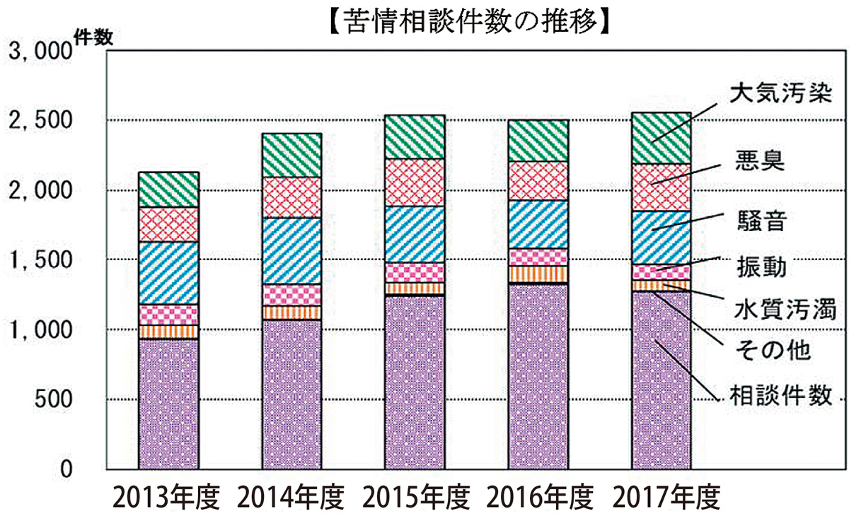 横浜市は14日、2017年度の生活環境に関する市民からの苦情相談件数を発表した。近年、苦情は増加傾向を示し、過去5年間で最多となる2556件となった。大気汚染や悪臭、騒音に関する苦情の増加が顕著となっている。