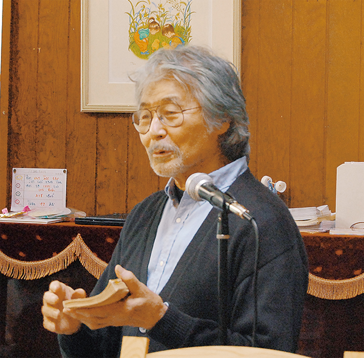 「ねずみくんのチョッキ」で知られる絵本作家のなかえよしをさんが18日、港南区のあゆみ幼稚園で「絵本のきもちで」と題し、講演した。同園の父母の会が企画し、在園児の保護者や同園の2歳児親子教室「チューリップクラブ」に通う子どもの保護者らが参加した。