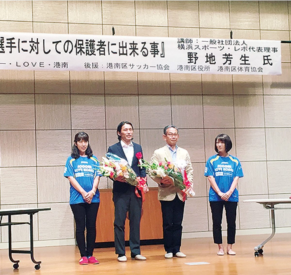 300人超の参加者に「子どもの姿は親がしてきたこと」「全ては自主性が前提」などと語った。また横浜F・マリノスなどで活躍し、地元の野庭キッカーズ出身の坂田大輔さんとのパネルディスカッションもあった。
