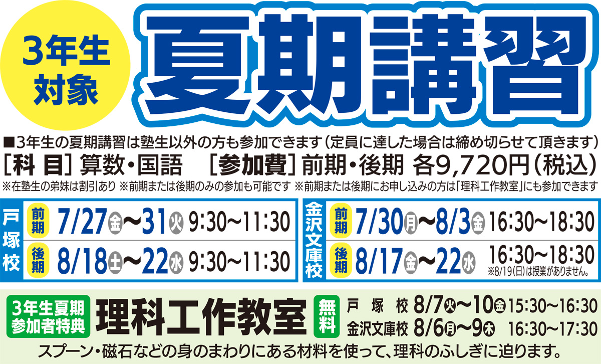 横浜市内で4教室を展開する中学受験専門塾『啓進塾』が、小学3年生対象の夏期講習を開催する。現在参加者を募集中だ。