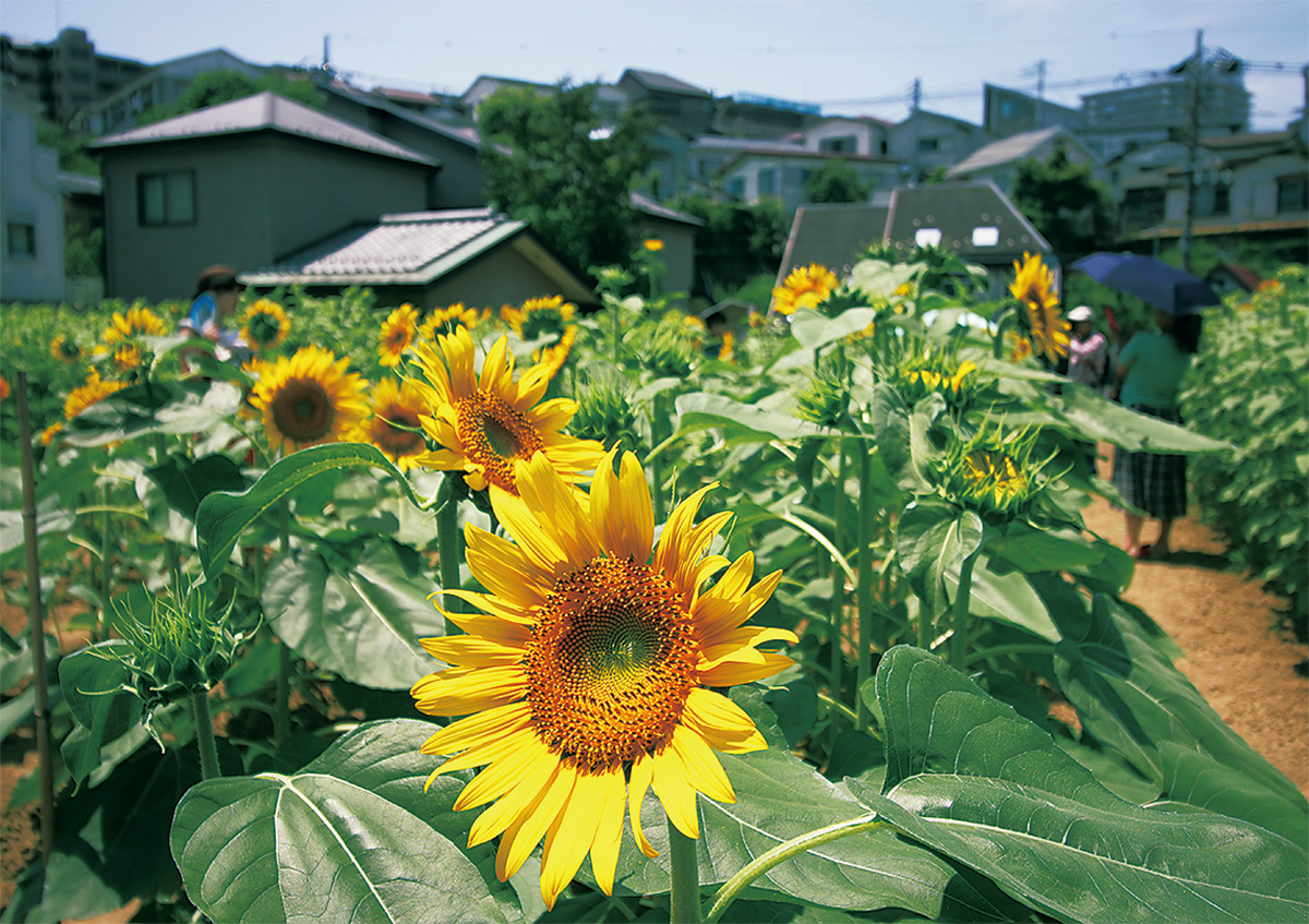 上大岡駅周辺の商店会が中心となって毎年3万本の花を咲かせている「大賀の郷・ひまわり畑」(港南区上大岡東1の34)の一般開放が19日に始まった。期間は29日まで。