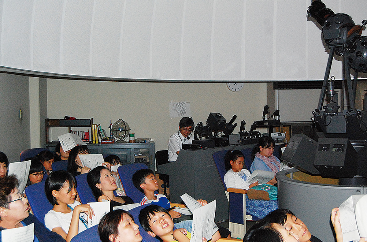 南高校で先月25日、地元の小学3年生から6年生までの児童と保護者を対象としたプラネタリウム体験会が開かれ、参加者約30人が夏の星空観察を楽しんだ=写真。主催は東永谷地区センター。南高校の協力を得て毎年開催している。