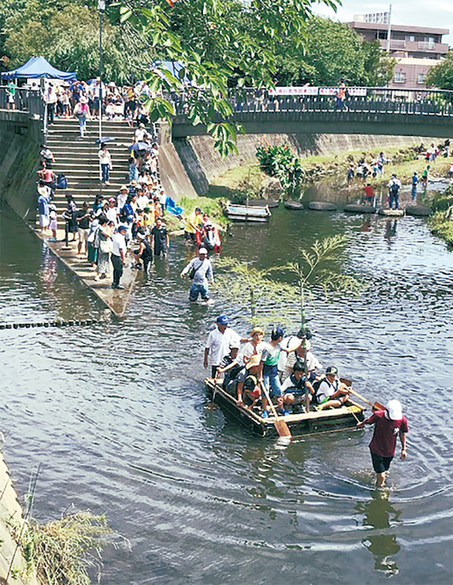 栄区役所近くの大いたち・小いたち橋広場で19日、いたち川まつりが開かれ、子どもたちがいかだ遊びなどで川に親しんだ。主催は同実行委員会。
