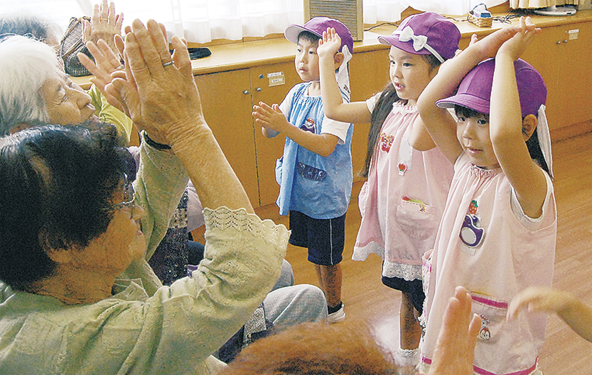 園児たちは「お寺の和尚さん」や「いっぽん橋こちょこちょ」の手遊びをはじめ、手作りのメダルや歌を贈った。また「もう少し強くたたいても大丈夫?」と声を掛けながら肩たたきも行った。参加した地元の高齢者は「自分にも同じような孫がいる。園児たちからの優しい気持ちが嬉しい」と微笑んだ。