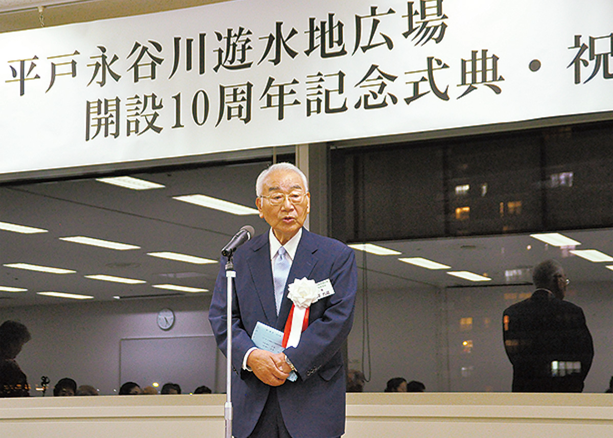 港南区と戸塚区のサッカーや野球、ソフトボールの利用者から親しまれてきた平戸永谷川遊水地広場の開設10周年を記念した式典が12日、上大岡西のウィリング横浜で開かれた。関係者が一堂に会し、節目を祝った。