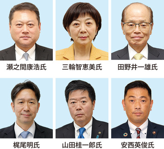 現職で立候補の意思を表明しているのは自民党の田野井一雄氏(78・9回)、共産党の三輪智恵美氏(65・1回)、自民党の瀬之間康浩氏(58・4回)、公明党の安西英俊氏(48・2回)、日本維新の会の山田桂一郎氏(55・3回)の5人。