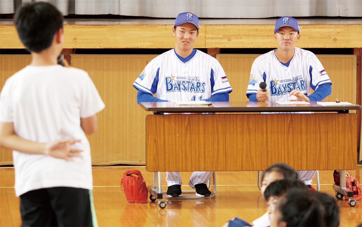 この日も児童たちの「夢」をもとに授業を展開し、2選手が体験談を交えて子どもたちの夢にエールを送った。横浜市青葉区出身の楠本選手は野球選手を目指す児童に「僕も小さい頃から『甲子園に出たい』と思い続けて今に繋がっている。まわりの助けを借りながら感謝を忘れずに、いつか一緒にプロでやれるように」と笑顔で激励した。