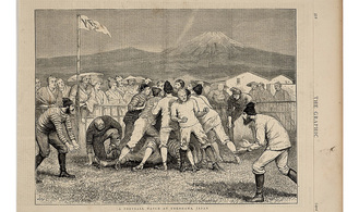 9月開幕のラグビーW杯を前に横浜開港資料館(中区)の2階のミニ展示コーナーで3日、「ラグビーと幕末・明治の横浜」と題した展示が始まった。8月31日(土)まで。