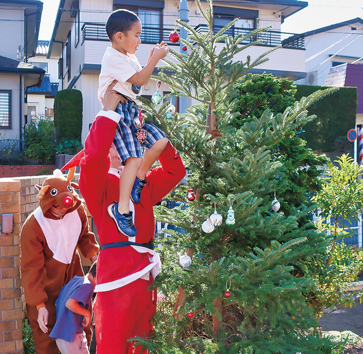 贈呈式にはサプライズで同社従業員がサンタとトナカイに扮して登場。ツリーの飾りを園児に配ると、子どもたちは思い思いに飾りつけを楽しみ「サンタさんにだっこしてもらえた」と喜んだ。