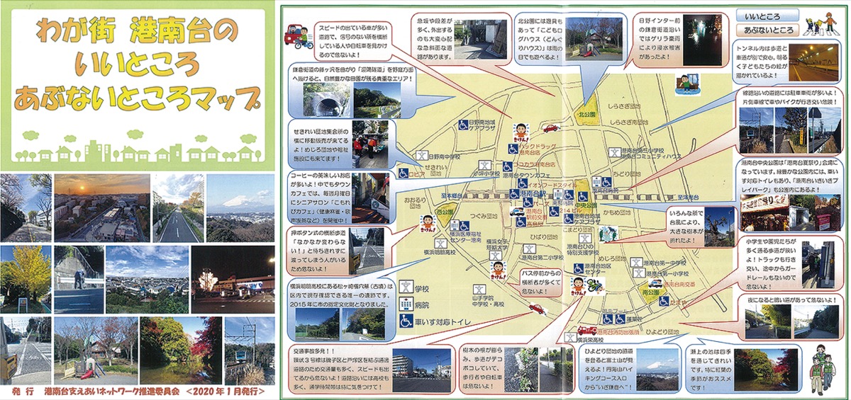 港南台の連合自治会や社会福祉協議会が中心となり、リーフレット「わが街 港南台のいいところあぶないところマップ」をこのほど発行し、配布している。意見交換を通じ、街の魅力や危険な場所を紹介している。