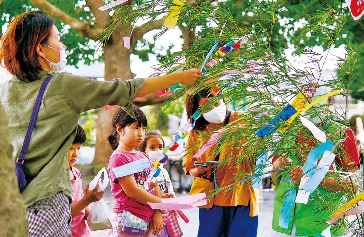 港南区上永谷の美晴台公園で7日、七夕飾りを取り付けるイベントが開かれた。コロナ禍で各種のイベントの中止が相次ぐ中、久しぶりの子ども向けイベントの開催とあって公園に子どもたちの歓声が響いた。