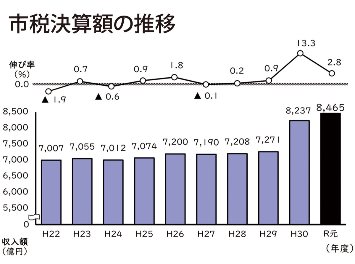 市税の決算額は、前年度に比べて227億3600万円増の8464億5600万円で4年連続で増収した。個人市民税は給与所得納税者数の増加などにより205億3300万円増加したものの、ふるさと納税のによる税流出額は131億円で前年と比べて35%増加した。一方、2016年から3年連続で増加していた法人市民税は企業収益の減少に伴い34億500万円減少し、586億円だった。