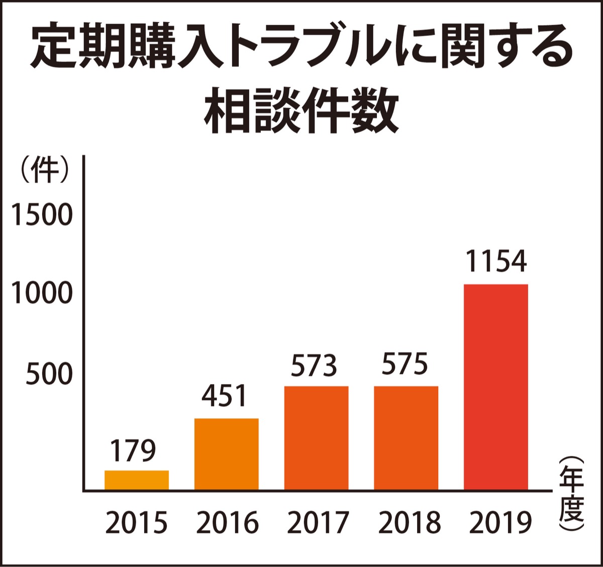 相談が増えているのは「青汁初回限定500円」「ダイエットサプリメントお試し300円」などの広告から、健康食品などを一度試すつもりで購入したが、実際は複数回届く定期購入だったトラブル。2015年度に179件だった相談は、16年度に451件に増加。17・18年度は500件台だったが、19年度に1154件と倍増した。
