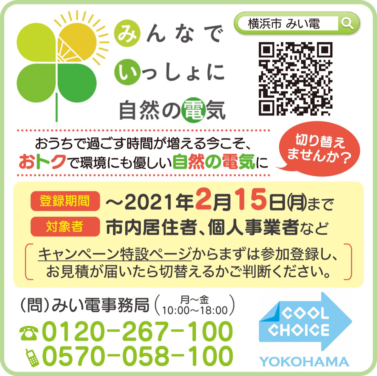 横浜市は市内の各家庭を対象に、自宅で使う電気を太陽光や風力といった「自然の電気」へ気軽に切替えられるキャンペーン『みんなでいっしょに自然の電気(みい電)』を開始した。