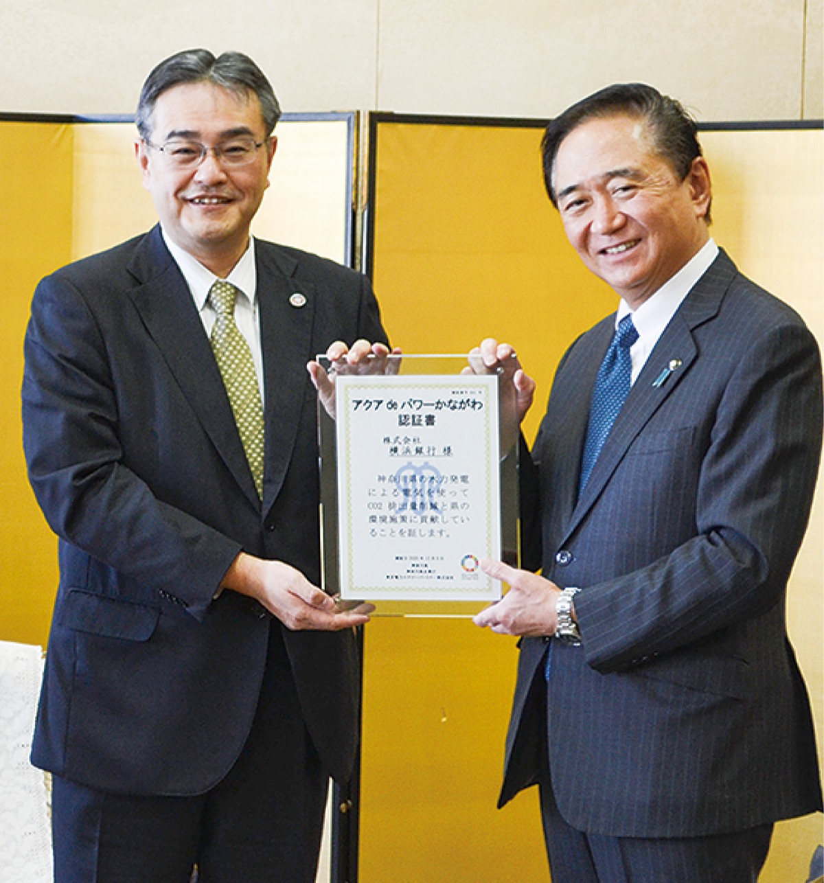 横浜銀行は、神奈川県の再生可能エネルギー施策「アクアdeパワーかながわ」を初めて導入するとして12月8日、県や県企業庁などから認証書を授与された。