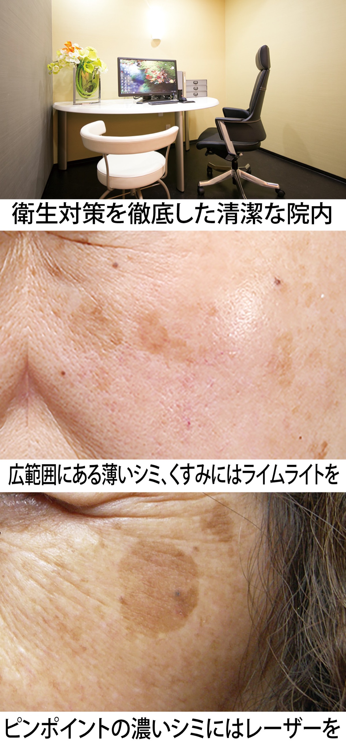 A 肌全体のトーンアップや薄いシミ(写真上)には、日本人医師が日本人の肌に着目し開発した、光治療器「ライムライト」を使用した治療があります。これは、520〜1100nmの幅の広い波長の光を顔全体に照射することで、肌のトーンアップや薄いシミ、そばかす、くすみ、また小ジワまで改善でき、さまざまな肌の悩みに対応できます。肌にダメージを与えることが少なく軽負担で効果が期待できます。また痛みの軽減もされています。
