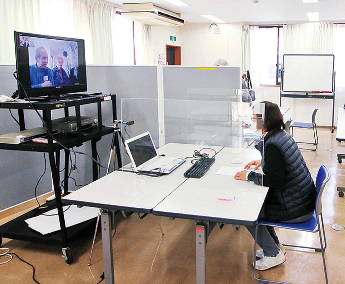 栄区社会福祉協議会の団体交流室に設置されたパソコンはインターネットで高齢者施設と繋がっており、この日はグループホームひかり横浜戸塚(戸塚区柏尾町)の利用者がモニターに映し出されていた。