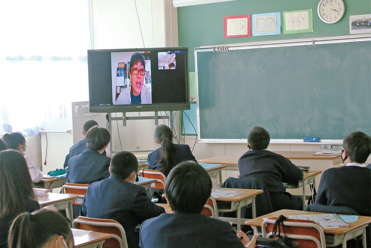講演会は当初、1年前に同校で開かれる予定だったが、新型コロナの影響で中止となっていた。このほどインターネットを活用したオンライン講演会が実現し、講師と代表生徒とのやりとりを全校生徒約400人が各教室で見守った。