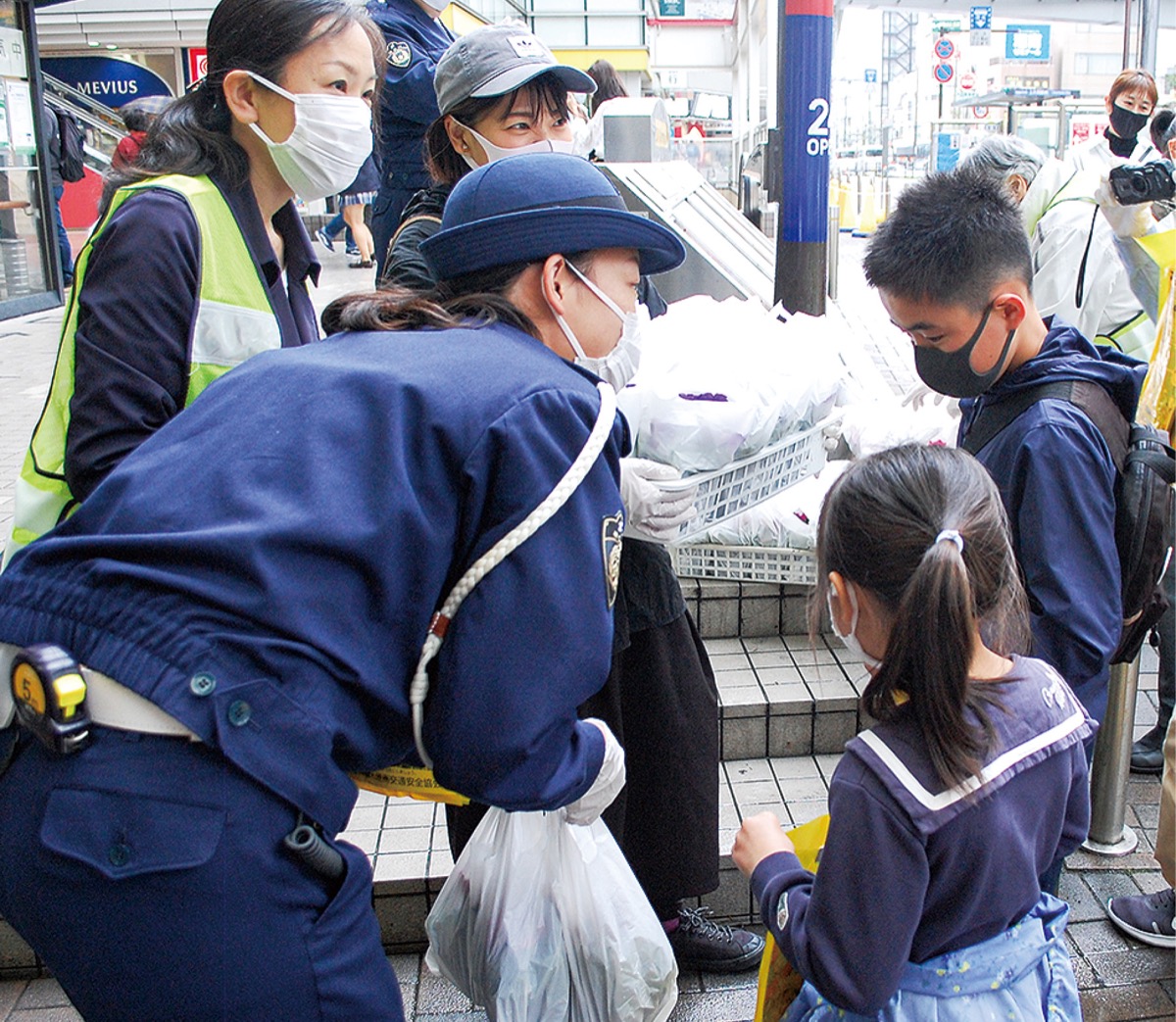 「交通事故死ゼロを目指す」「交通安全」などと印字された幟旗を掲げ、事故防止を通行人や駅利用者らに訴えた。また、署員や会員は花苗300個や交通ルールが書かれた印刷物、啓発グッズを配布し「事故にあわないように」と通行人に呼びかけた。菅野署長は「(各団体と)力を合わせて、少しでも交通事故が減るように、痛い思いをする方がいなくなるように安全安心のために尽力する」と話した。