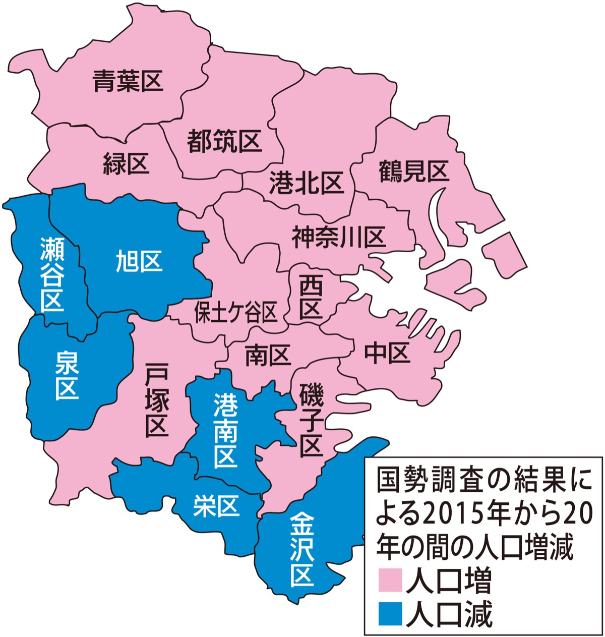 一方、市内南西部の6区では減少。最も減少数が多かったのが金沢区で3196人減(人口19万9033人)。次いで栄区が1908人減の12万263人だった。港南区も540人減少で21万5196人だった。