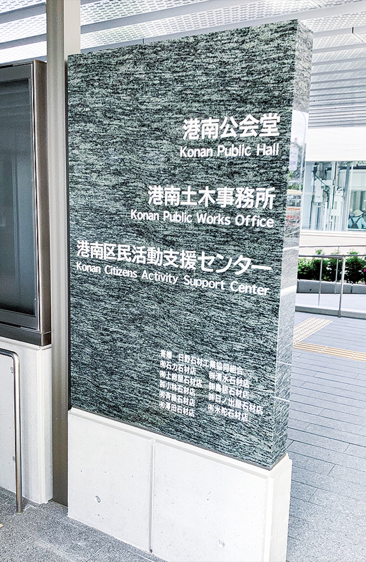 館銘板には「港南公会堂」のほか、同じ建物内にある「港南土木事務所」と「港南区民活動支援センター」の文字に加え、同組合に加盟する(株)鳥居石材店、(株)清水石材店、(有)斉藤石材店、(株)小林石材店、(株)日ノ出屋石材店、(有)上總屋石材店、(有)石力石材店、(有)澤田石材店、(有)米陀石材店の9社の名前も記された。
