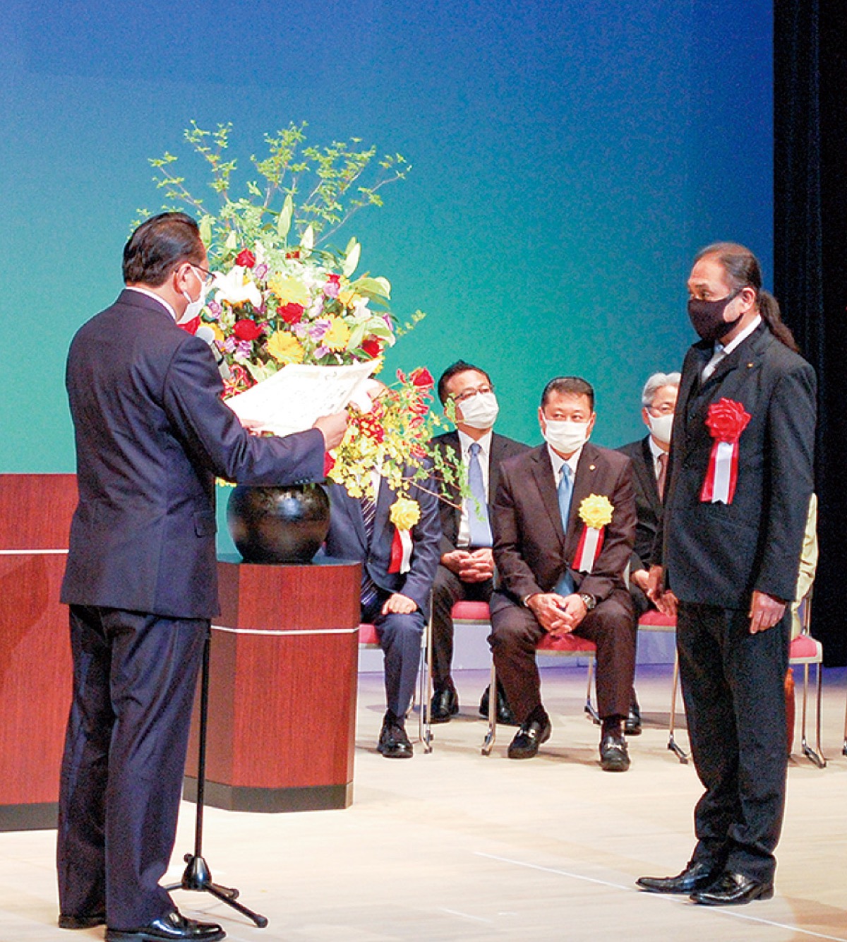 日野石材工業協同組合(臼井瑞穂理事長=今号人物風土記で紹介)がこのほど、港南公会堂入口付近に館銘板を寄贈した。館銘板は高さ150センチ、幅97・5センチ、厚さ15センチのオリーブグリーンの御影石。5月9日に行われた開館記念式典の中で栗原敏也港南区長から臼井理事長に感謝状が直接手渡された。