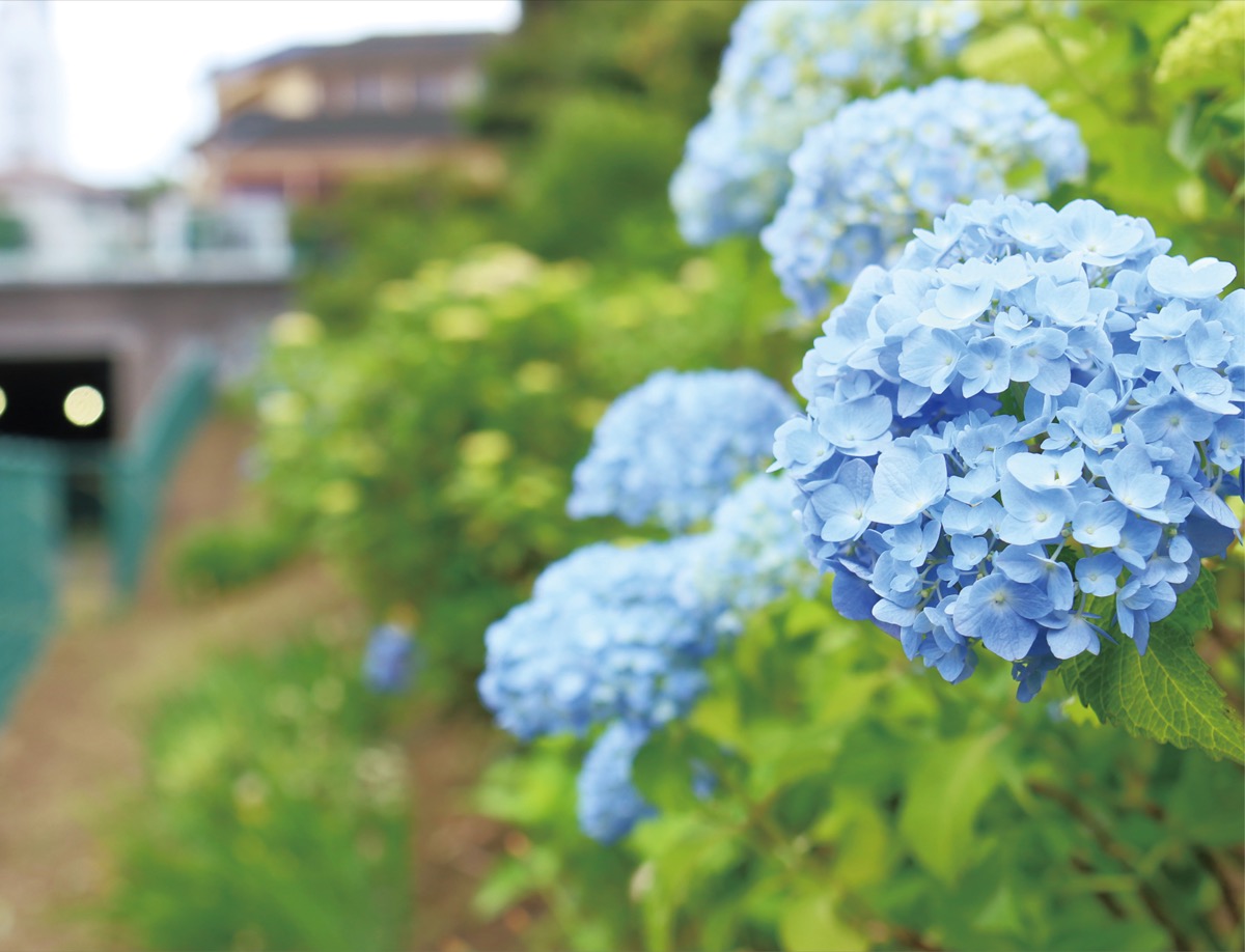同公園では愛護会が10年以上前からアジサイを育てはじめ、今では100株以上のアジサイが毎年住民の目を楽しませている。愛護会の森貴会長によると、今年は例年より1〜2週間早く開花を迎えているという。