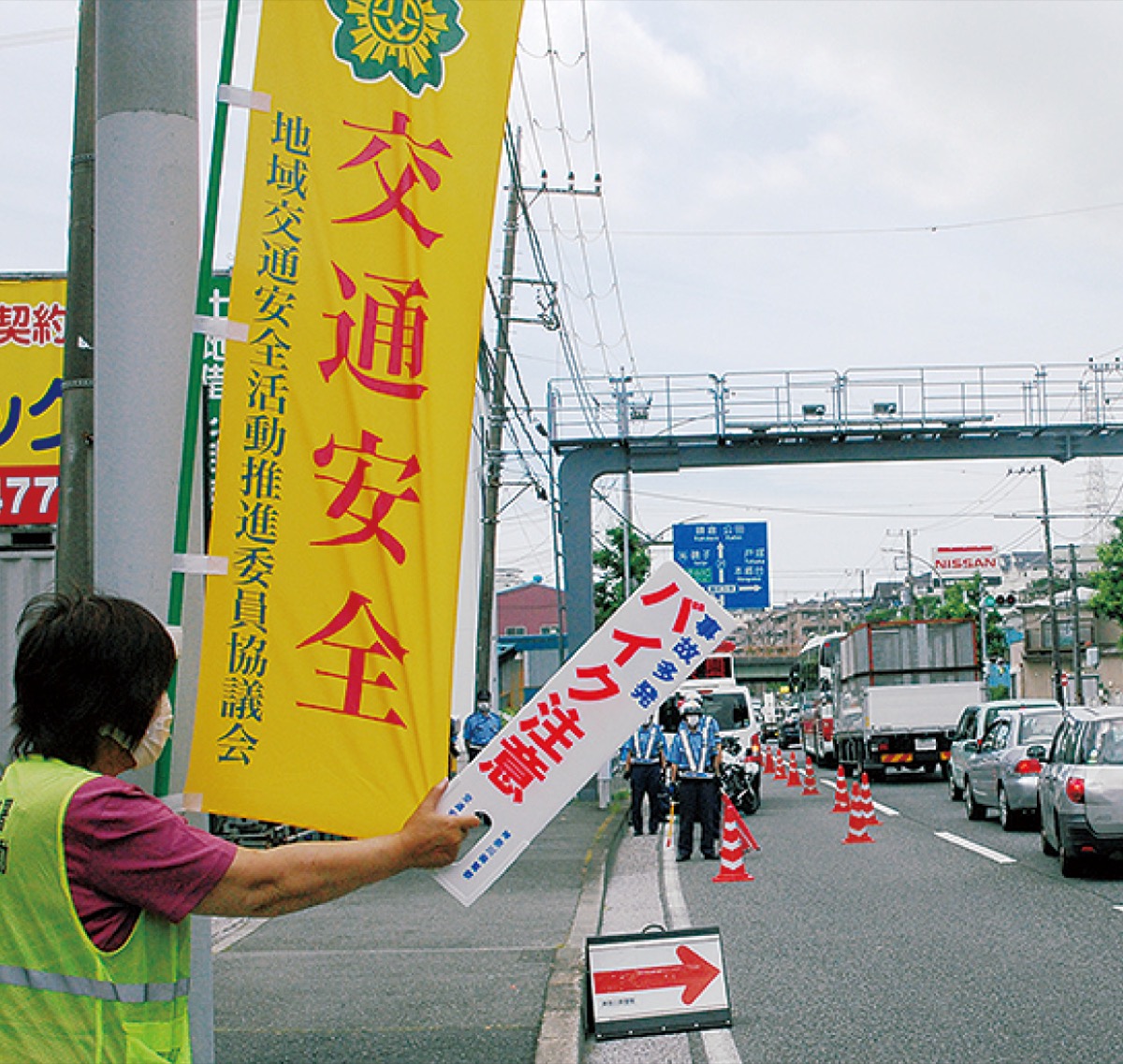 二輪車事故防止強化月間にちなんだもので、当日は6警察署に加え、各交通安全協会など関係機関から約50人が参加。交通量の多い鎌倉街道沿線で6署が15分刻みの「ウェーブ型対策」でバイクや原動機付自転車の運転者に対し、安全運転を促した。港南署では港南車庫入口交差点で関係者が「バイク注意」「交通安全」と書かれた掲示物などで二輪ドライバーへ注意喚起をした。