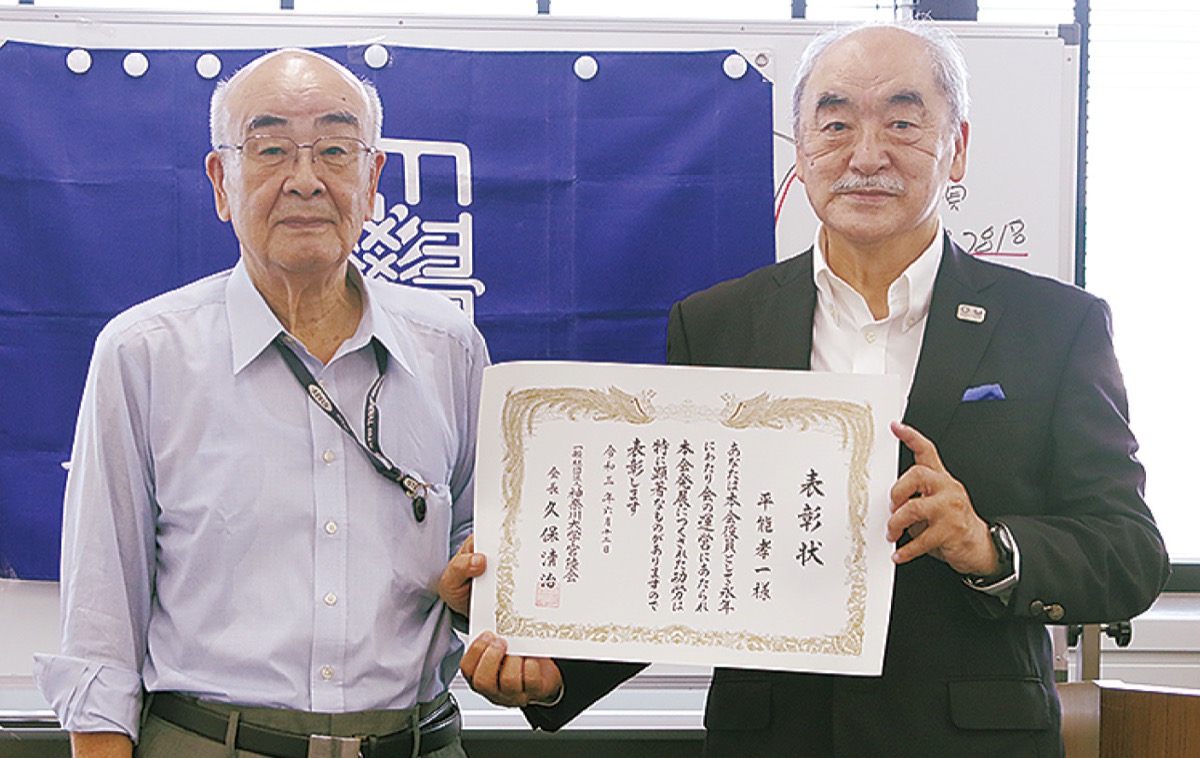 神奈川大学のOB・OG組織「港南区宮陵会」が7月10日、上大岡のウィリング横浜で第12回となる定時総会を開催した。総会では事業の報告や計画が承認されたほか、同会の平能孝一会長が本部組織の「神奈川大学宮陵会」から功労表彰を受けたため、表彰状の授与も行われた。