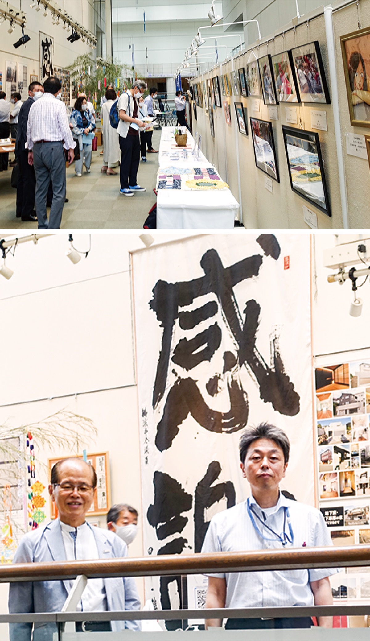 期間中は同ギャラリーに建築作品や写真、絵画、工芸など数多く展示。同会の顧問を務める田野井一雄さんの「感謝」の書も掲げられた。また、住まいの相談窓口コーナーを設け来場者の質問に回答していた。
